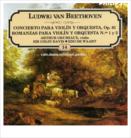 Beethoven Violin Concerto in D major Op 61 1,2,3.....순으로 연속듣기 (41'17) 1. Allegro ma non troppo 23'58 2. Larghetto 08'56 3. Rondo (Allegro) 09'03 베토벤은 바이올린 협주곡을 한 곡밖에 완성하지 않았다. 그는 16년 전인 1790년에 이미 C장조를 작곡하기 시작했으나 제1악장의 전개부를 쓰다 말고 중단해 버린 일이 있었다. 그러나 이 D장조는 바이올린 협주곡이라는 악곡 형식이 지니는 온갖 가능 성을 내포하고 있으므로 더 이상 다른 곡을 작곡하지 않아도 그의 위대한 천재 는 유감없이 발휘되었다고 할 수 있다. 그뿐만 아니라 이 협주곡은 그 이전의, 모짜르트까지의 바이올린 협주곡을 전부 습작처럼 보이게 만들었다. 여기에는 그 무렵 그의 다른 곡에 곧잘 보이던 병적인 그늘이 없고 비극의 징후(徵候)도 없다. 테레제 폰 브륀슈비크(Ther ese von Brunwick)와의 약혼으로 생애 중 가장 행복한 시기(1806년, 36세)를 맞고 있기 때문이었다. 그의 아홉 개 교향곡 중 눈에 띄게 온화한 제4번 역시 같은 무렵에 작곡한 작품이다. Arthur Grumiaux, violin Royal Concertgebouw Orchestra Sir Colin Davis, cond