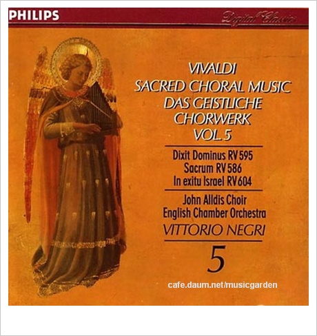 Antonio Vivaldi Dixit Dominus in D major RV 595 주께서 말씀하셨다 6,1,2,3,.....11 순으로 연속듣기 (24'19) 01. Dixit Dominus 02'16 02. Donec ponan inimicos 04'02 03. Virgam virtutis tuae 02'43 04. Tecum principium 02'00 05. Juravit 01'53 06. Dominus a dextris tuis 01'49 07. Judicabit 03'57 08. Da torrente 02'38 09. Gloria Patri 01'59 10. Sicut erat 00'58 11. Et in saecula saeculorum 02'44 Performer Felicity Lott (Soprano), Margaret Marshall (Soprano) Susan Daniel (Mezzo Soprano), Robert Holl (Bass), Thomas Thomaschke (Bass) Michael Laird (Clarino), Anne Collins (Alto) Anthony Rolfe Johnson (Tenor) Ian Wilson (Clarino), Gerald Ruddock (Clarino) Olga Hegedus (Cello), Dietrich Bethge (Cello) English Chamber Orchestra John Alldis Choir Vittorio Negri, cond 1979 년 녹음 *음원 출처(국외 사이트)